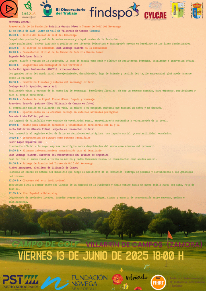 FINDSPO, la plataforma tecnológica más avanzada sobre despoblación, se incorporará al patronato como patrono tecnológico. Y el broche lo pondrá de nuevo Juan Domingo Palermo, hablando de la comunicación como motor de transformación social. Todo está pensado para emocionar, inspirar y movilizar.